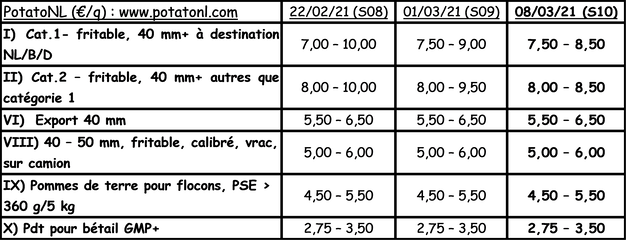 Pour l’industrie, la hausse des prix s’est arrêtée la semaine passée avec le retrait de l’essentiel des acheteurs (industrie, négoce et même producteurs pour compléter des volumes manquant sous contrat). Les conditions de marché n’ont pas pour autant vraiment changé, mais il manque une nouvelle impulsion alors que les travaux au champ ont démarré. La météo de cette semaine pourrait néanmoins venir calmer les ardeurs. Les industriels continuent de mettre de l’énergie dans la signature des contrats 2021/2022 car tout n’est pas encore signé… L’export ne se redynamise pas pour l’instant : des volumes réguliers partent vers les Caraïbes et l’Afrique, un peu vers l’Espagne et le Portugal, rien de plus. Les pays de l’Est et l’Ukraine commandent aussi mais à prix très discutés.
