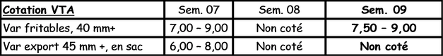 Calibre 35 – 45 mm : 60,00 – 70,00 €/q, prix fermes.