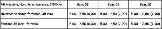 Pdt industrielle, vrac, départ, hTVA, Nord Seine, €/qt, min – max (moy) (RNM) :