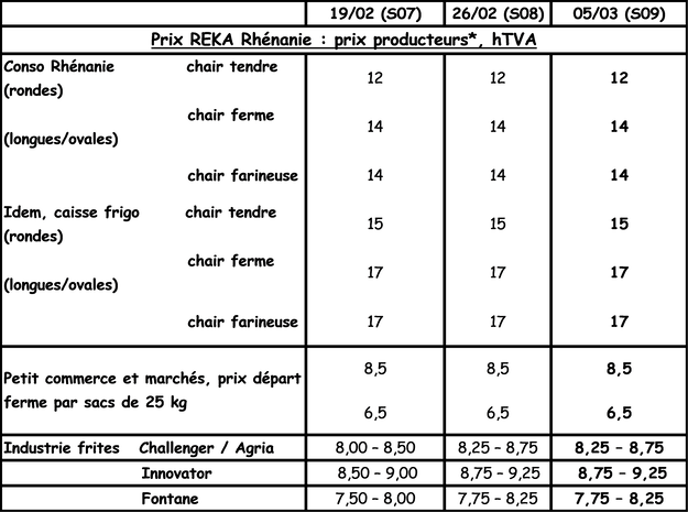 Marché du frais (hâtives et mi-hâtives) : prix des chairs fermes en légère hausse : 11,00 €/q (10,83 €/q, avant dernière cotation) et plus ferme également en chairs tendres/farineuses : 10,33 €/q (10,25 €/q, avant dernière cotation). Mais la marchandise issue des stockages caisses – palettes en frigo est 3 € plus élevée (voir prix REKA dans tableau !).