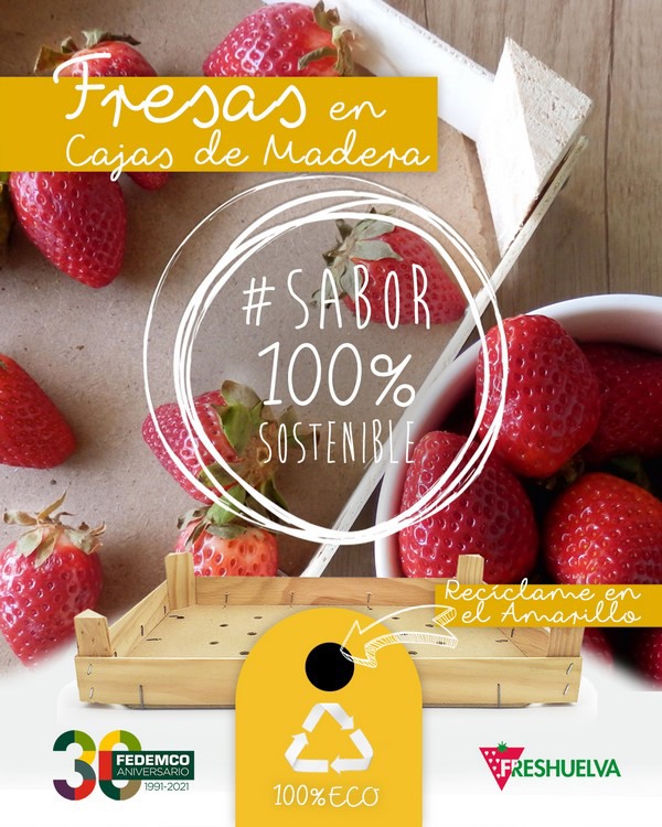 Freshuelva et Fedemco collaborent sur une nouvelle campagne intitulée « Sabor 100 % Sostenible » (saveur 100 % durable) pour promouvoir les fraises de Huelva dans des plateaux en bois.