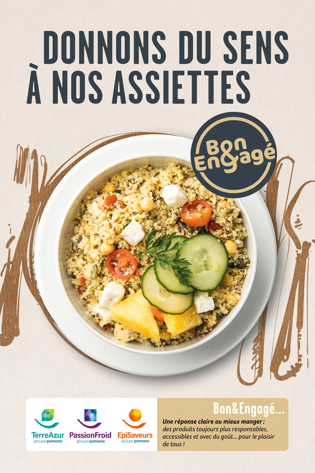 « Une réponse claire au mieux manger : des produits toujours plus responsables, accessibles et avec du goût… pour le plaisir de tous ! » Voici la promesse de Bon&Engagé, la nouvelle marque propre du Groupe Pomona commune aux réseaux TerreAzur, PassionFroid et EpiSaveurs.