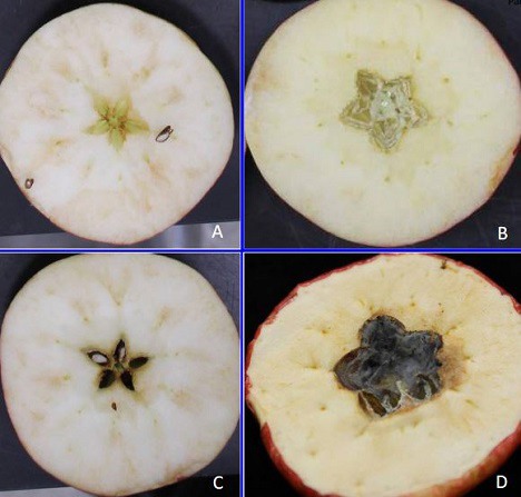 Symptômes de la pourriture du cœur des pommes Sweet Tango causés par Alternaria arborescens. A) Fruit non infecté ; B) Fruit infecté naturellement (infection légère) ; C) Fruit infecté naturellement (infection modérée) ; D) Fruit infecté naturellement (infection sévère).