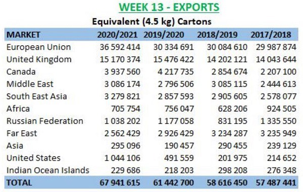 L'industrie sud-africaine du raisin de table a publié des chiffres de consommation qui montrent qu'il y a deux semaines, la limite supérieure de l'estimation de la récolte était déjà dépassée par la consommation de 71,8 millions de cartons de 4,5 kg.