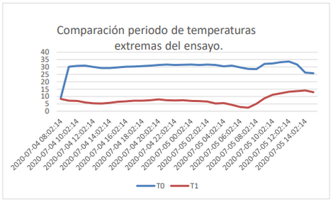 On peut clairement observer la différence de températures générées lorsqu'il y a des montées de chaleur, les niveaux bas étant maintenus avec l'utilisation d'Agricooler. Cela le rend essentiel pour l'accumulation d'heures de froid et leur qualité dans des climats chauds comme celui du centre du Chili.