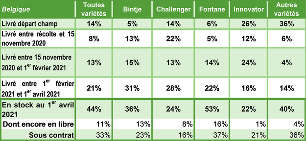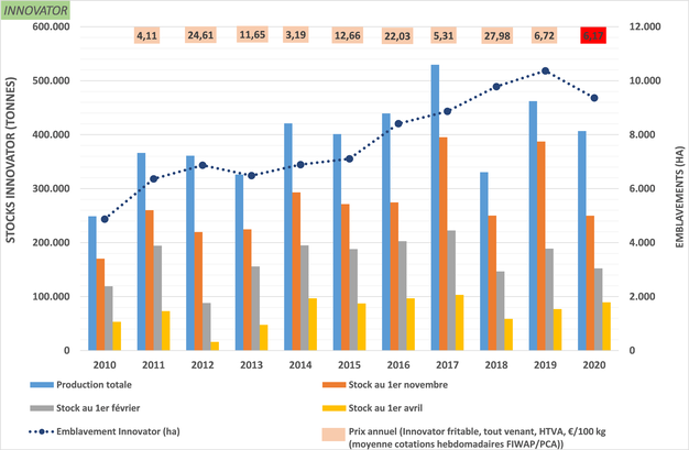 Les stocks au 1er avril ne représentaient plus que 22 % de la production initiale, soit +/- 90 000 tonnes, contre 18 % (soit 80 000 tonnes) ces 3 dernières années. Ces stocks sont quasi intégralement contractés. Ils étaient déjà très faibles début février (150 000 tonnes). Innovator est surtout présente en Wallonie et très peu en Flandre.