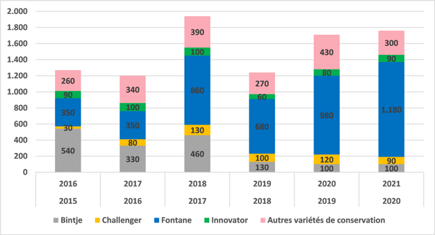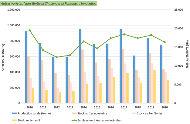 Il s’agit principalement de Markies, Royal, Ramos, Lady Claire… Début avril elles étaient encore présentes à raison de 300 000 tonnes dans les stocks belges, soit 17 % de moins que la moyenne des 3 dernières années (360 000 tonnes) et 10 % de moins que la moyenne quinquennale. La majeure partie des stocks (89 %) est sous contrat, de sorte qu’il ne restait que +/- 30.000 tonnes de libres (contre 70 000 tonnes ces 3 dernières années). La superficie de ces variétés à tendance à se stabiliser entre 15 000 et 20 000 ha.