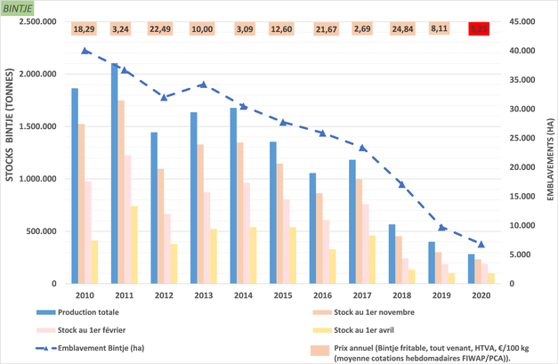 Déjà faibles début février, les stocks de Bintje sont estimés à moins de 100 000 tonnes début avril, dont 60 000 tonnes sous contrat et 40 000 tonnes libres. La saison se termine donc pour cette variété dont le créneau des frites fraiches est devenu le principal débouché ces dernières années. La période février – mars a dégagé +/- 90.000 tonnes. Ce topo de fin de saison est très semblable à l’an dernier.
