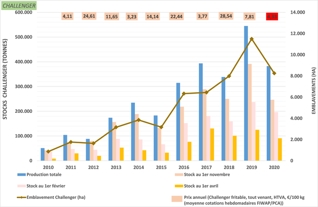Il restait moins de 100 000 tonnes de Challenger dans les hangars belges début avril, dont 60 000 tonnes sous contrat et 30 000 tonnes libres. C’est moins que l’an passé pour cette variété dont le dégagement se fait globalement de plus en plus tôt. La période février – mars a fait sortir de l’ordre de 110 000 tonnes des hangars, essentiellement sous contrat. Les stocks de Challenger sont inférieurs à la moyenne de 3 dernières années, et semblables à la moyenne des 5 dernières années.