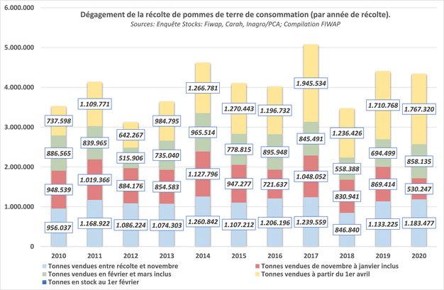 Evolution des stocks belges depuis la récolte 2020 jusque début avril 2021