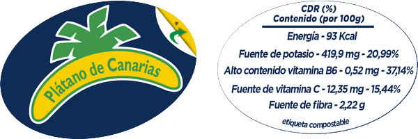 La santé est devenue un facteur très important pour les consommateurs lorsqu'ils achètent des aliments, c'est pourquoi Plátano de Canarias a voulu faciliter cette évaluation. L'étiquette comprend des informations sur le contenu nutritionnel pour 100 grammes et le pourcentage de l'apport journalier recommandé (AJR) pour chaque composant. Le Plátano de Canarias se distingue par sa teneur élevée en vitamine B6, ainsi que par le fait qu'il est une source de potassium, de vitamine C ainsi que de fibres.