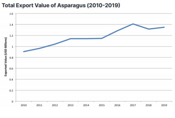Les ventes mondiales pour les exportations d'asperges par pays ont totalisé 1,4 milliard de dollars US en 2019. La valeur des exportations a augmenté en moyenne de 20,5 % pour tous les pays exportateurs en 2019 par rapport à 2015, année où les expéditions d'asperges ont été évaluées à 1,1 milliard de dollars US.