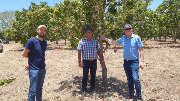 L'exportateur Rodolfo Meza de Aztec Fruits, le producteur Don Jésus Soliz et le consultant Piet Schotel.