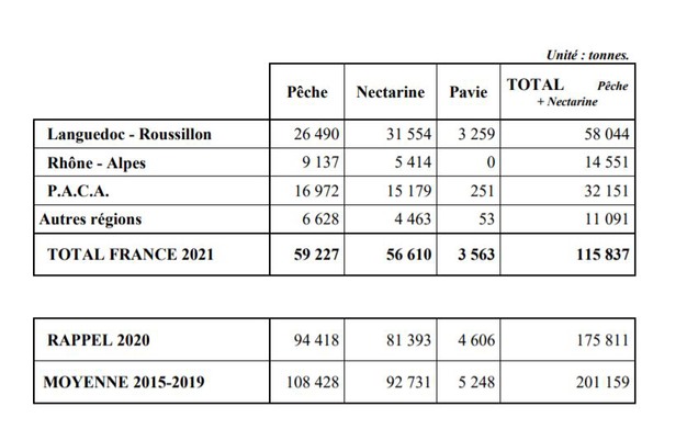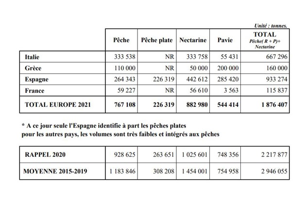 En 2020 la production de pêches rondes, plates et de nectarines atteignait environ 1 000 000 de tonnes soit une baisse de 18 % par rapport à 2019. Pour 2021 une baisse de production est attendue, notamment en raison du gel avec 930 000 tonnes de pêches rondes, plates et de nectarines soit moins 7 % par rapport à 2020 et moins 25 % par rapport à la moyenne 2015/2019. 285 000 tonnes sont attendues pour les pavies, soit une baisse de 3 % par rapport à 2021 et de 4 % par rapport à la moyenne 2015/2019.
