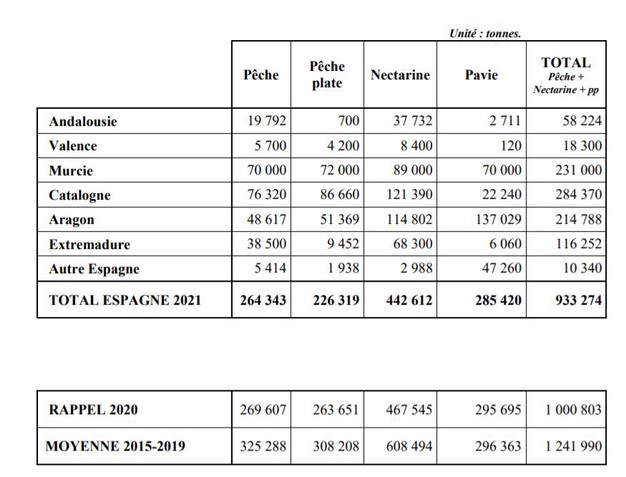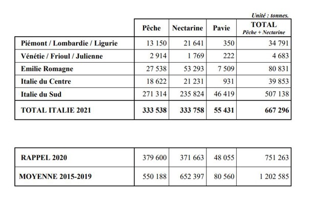 Avec un total de 690 000 tonnes pour l’année 2020 (185 000 tonnes de pêches, 105 000 tonnes de nectarines et 400 000 tonnes de pavies), les prévisions pour 2021 s’élèvent à 360 000 tonnes : 110 000 tonnes de pêches soit la moitié d’une année normale, 50 000 de nectarines contre 120 à 130 000 tonnes sur une année normale. Soit une diminution de 45 % par rapport à l’année dernière et de 47 % sur la moyenne 2015/2019. Pour les pavies cette année les estimations annoncent une production de 200 000 tonnes, soit une diminution de 50 % par rapport à 2020 et de 46 % par rapport à la moyenne 2015/2019.