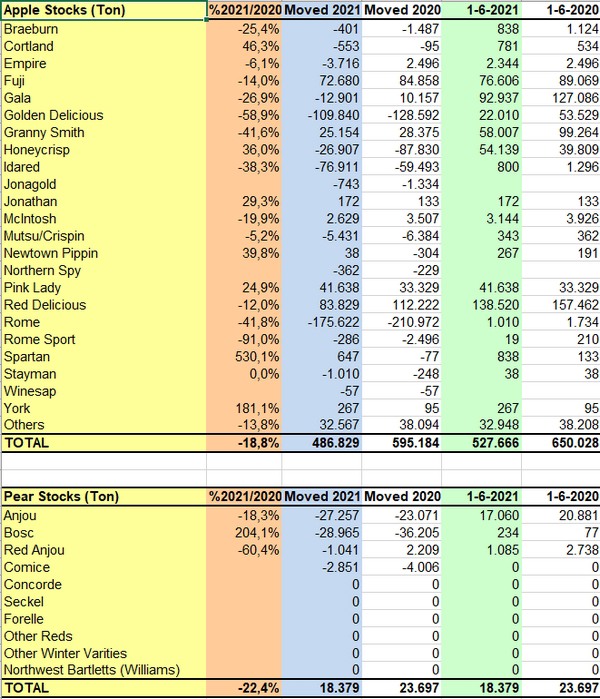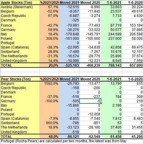 Les stocks de pommes et de poires de l'hémisphère nord ont été publiés pour le mois de juin 2021 par la WAPA. Selon le rapport, des pays comme la Pologne et l'Italie ont déplacé plus de la moitié de leurs stocks de pommes restants par rapport aux stocks de la fin avril. Pour les poires, les Pays-Bas ont environ trois fois plus de stocks que la Belgique, l'Espagne arrivant en troisième position.