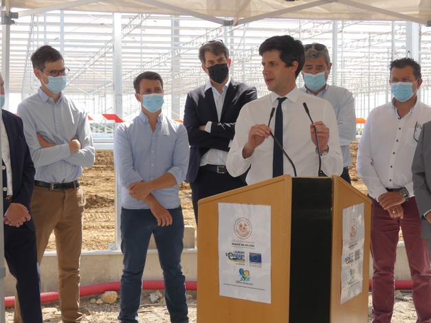Le ministre de l’Agriculture, Julien Denormandie, en visite dans les serres en construction.
