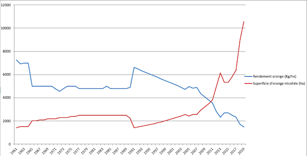 « Une étude conduite par Félicien Akohoue et ses collaborateurs en 2017 dans le département de Zou, estime la taille moyenne des vergers agrumicoles à 3.18 hectares. Par ailleurs, le graphique ci-dessous rendant compte des rendements et superficies récoltées de 1960 à 2019, met bien en avant le fait que la production des oranges est de plus en plus extensive dans le pays.