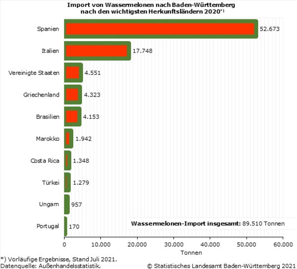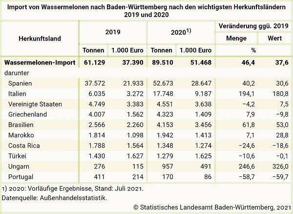 L'Office statistique du Land allemand de Bade-Wurtemberg, en utilisant les résultats préliminaires des statistiques du commerce extérieur, annonce qu'environ 89 500 tonnes de pastèques d'une valeur de 51,5 millions d'euros seront importées dans le Bade-Wurtemberg en 2020. Cela correspond à une augmentation du volume d'importation du fruit de 46 % par rapport à l'année précédente. Cela signifie que 159 % de pastèques en plus seront importées en 2020 par rapport à il y a dix ans.** Mesurée par rapport à la population du Bade-Wurtemberg, la quantité importée de pastèques en 2020 correspond à une quantité de 8,1 kg par habitant.