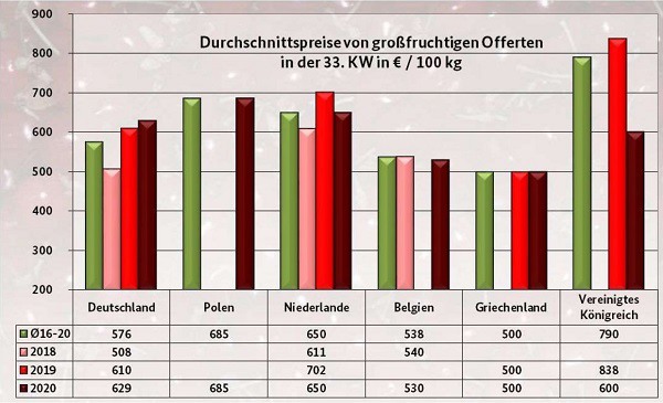 L'offre a été très variée, avec une prédominance des Cacak's Schöne nationales et moldaves. Dans l'ensemble, la disponibilité était suffisante pour répondre à la demande. En raison des livraisons prolongées, les négociants ont été contraints de temps à autre d'ajuster leurs prix à la baisse.