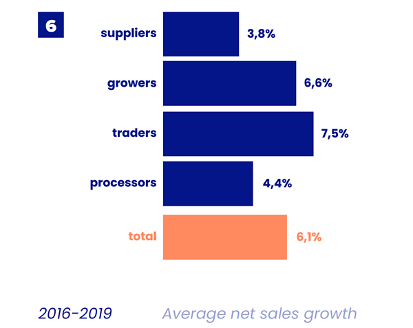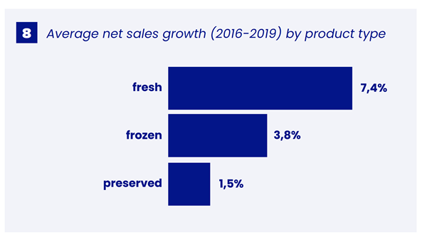 Les entreprises du secteur des fruits et légumes ont affiché une croissance saine au cours de la période considérée. La moyenne annuelle a été de 6,1 %. Les consommateurs préfèrent de plus en plus les fruits et légumes frais (croissance de 7,4 %). Ils préfèrent les fruits et légumes frais (croissance de 7,4 %) aux produits surgelés (croissance de 3,8 %) et aux conserves (croissance de 1,5 %). Ces derniers sont considérés comme moins sains. Dans la catégorie des fruits frais, ce sont les entreprises qui se concentrent sur les fruits plus exclusifs, tels que les fruits exotiques et les fruits mous, qui se développent le plus.