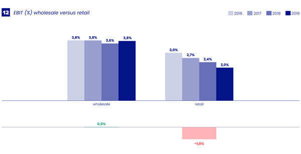 Au cours des années examinées, les marges des fournisseurs de détail ont subi une forte pression. Le renforcement de la législation et de la réglementation en est la cause. Mais aussi, les prix (contractuels) ne compensent pas le niveau plus élevé de service requis. L'augmentation des coûts de main-d'œuvre par rapport aux ventes est particulièrement frappante. A-INSIGHTS n'a pas constaté cette évolution dans le segment du commerce de gros. Cela alimente l'idée que de nombreux fournisseurs s'intéressent davantage à ce secteur.