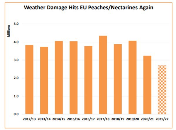 La production mondiale de pêches et de nectarines pour 2021/2022 devrait légèrement augmenter pour atteindre 21,8 millions de tonnes. Cela en raison du rétablissement des stocks de la Chine, après les pertes dues aux conditions météorologiques de l'année dernière. Ce qui fait plus que compenser les pertes dues aux mêmes raisons, cette année, dans l'Union européenne et en Turquie. Les exportations devraient cependant diminuer, en raison de la réduction des expéditions de la Chine et de l'Ouzbékistan qui contrebalance l’augmentation de celles des États-Unis.