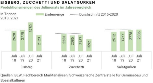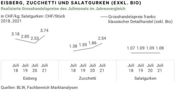 Le mois de juillet 2021 a été le plus humide jamais enregistré, selon MétéoSuisse. Les principales zones de culture de légumes, comme la région du Seeland, ont également été sévèrement touchées. Des pertes de récoltes ont eu lieu en raison de l'eau stagnante et des dommages causés par la grêle, et les champs humides ont empêché la poursuite des cultures avec des machines. Dans ce qui suit, les effets directs de cette phase de mauvais temps sur la situation du marché en juillet sont examinés. L'évolution du marché de quatre légumes différents est présentée : deux légumes typiques de plein air (laitue iceberg, courgettes), et à titre de comparaison, un légume cultivé principalement en serre (concombres) et un légume principalement importé (piments).