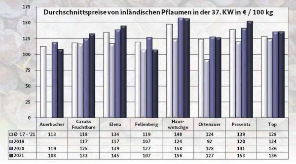 Les offres de prunes locales ont constitué la base de l'assortiment, surtout Hauszwetschge, Top et Ortenauer. La présence des Fruchtbare de Cacak était évidemment limitée, tandis que l'importance de Presenta a augmenté.