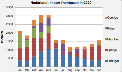 Le Royaume-Uni a importé un peu moins de framboises l'année dernière. Il en a pris 26 200 tonnes. Lors de l'année record de 2019, c'était 27 900 tonnes. Plus de la moitié provient habituellement d'Espagne, ce qui inclut probablement les réexportations marocaines. Selon les statistiques d'exportation du Royaume-Uni, les Pays-Bas sont leur deuxième plus grand fournisseur de framboises.