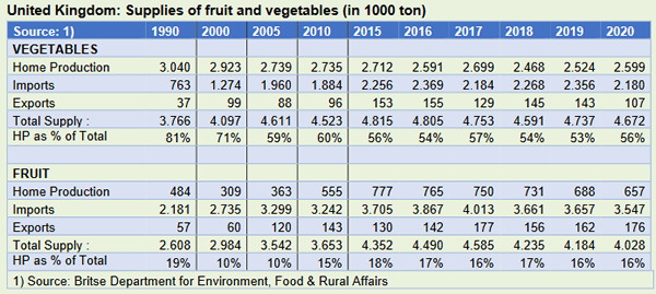 Avec environ 3,5 millions de tonnes de fruits et 2,2 millions de tonnes de légumes, le Royaume-Uni est un grand importateur. Pour les légumes, il est en troisième position, après les États-Unis et l’Allemagne et en sixième position pour les fruits. Il suit les États-Unis, l'Allemagne, la Russie, la Chine et les Pays-Bas. La Grande-Bretagne importe principalement des tomates, 400 000 tonnes, et des oignons, 300 000 à 400 000 tonnes.