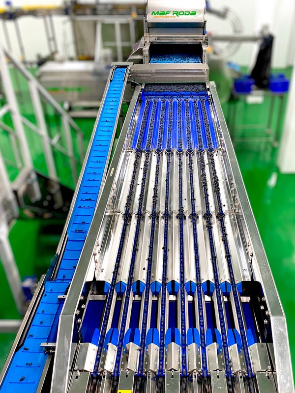 En plus de cet emballage haut de gamme, ce système est intégré à toutes ses machines de tri et de calibrage MAF RODA, qui analysent l'intérieur et l'extérieur de la myrtille. La combinaison avec les systèmes BERRYSCAN et INSIGHT, par exemple, permet de classer chaque fruit en fonction de son taux de sucre (Brix).