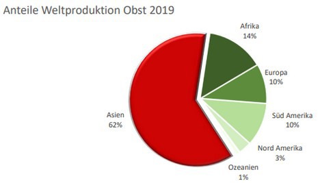 La production mondiale de fruits s'est élevée à environ 883,4 millions de tonnes en 2019, soit une augmentation d'environ 1,4 % par rapport à l'année précédente. Alors que l'Europe a enregistré des rendements en baisse de - 8,7 %, l'Asie a encore étendu sa suprématie en tant que premier producteur mondial de fruits avec une croissance de 2,6 %. C'est ce que rapporte l'AgrarMarkt Austria (AMA) dans des statistiques complètes.