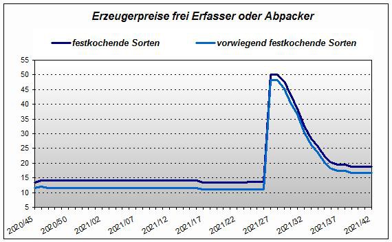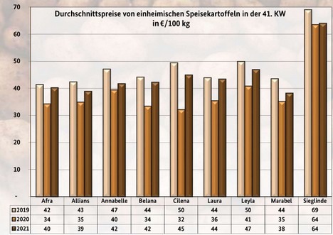 Selon la base (classement 35 - 65, moins de 8 % de défauts, marchandise légère et à peau ferme, en vrac, entrée libre par 100 kg), les prix suivants ont été payés la semaine dernière, selon l'Association des agriculteurs de Basse-Saxe :