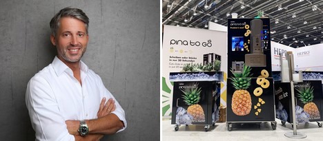 À gauche : Christoph Wolter, PDG de Hepro. À droite : la famille pina-to-go composée de la machine à éplucher et du bac à glace de Hepro.