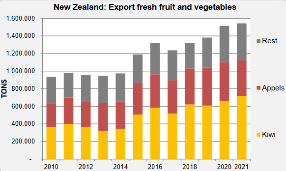 Cette année, la Nouvelle-Zélande a, une fois de plus, exporté beaucoup plus de fruits et légumes frais. Près de 3 milliards de dollars, soit 11 % de plus qu'en 2020. En 2017, c'était encore 2 milliards de dollars. Les kiwis dominent très largement le tableau, avec deux tiers du total de cette année. La valeur des exportations (FOB) de kiwis néo-zélandais atteindra 1,92 milliard de dollars. C'est ce que rapporte Jan-Kees Boon de Fruit and Vegetable Facts.