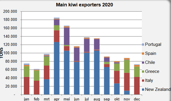 La croissance de ce produit est principalement due aux exportations de kiwis gold (jaunes). Celles-ci représentent désormais près de 60 % du total, contre 45 % en 2017. En termes de volumes, il s'agit de 420 000 tonnes contre 225 000 tonnes en 2017. Les exportations de kiwi vert sont, elles aussi, un peu plus importantes cette année qu'en 2020. Ces volumes étaient toutefois déjà plus élevés en 2018.