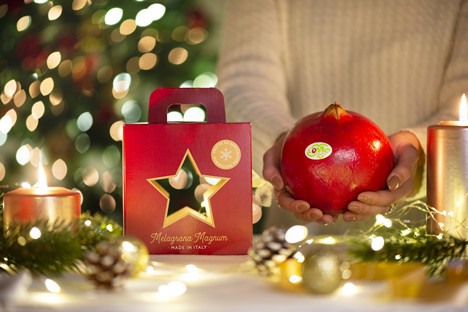 « Pour Noël 2021, nous réintroduisons la boîte Melagrana Magnum, étant donné le succès de l'édition précédente. Il s'agit d'une boîte en carton de 13x13,5 cm, disponible en deux couleurs (rouge et vert), avec une grenade qui pèse au moins 850 grammes. En plus d'être un cadeau, la boîte peut être utilisée comme une lanterne pour la décoration, grâce à un trou dans le fond pour insérer une lumière. »