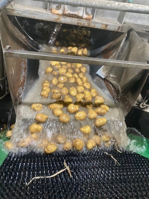 Avant d'être lavées, les pommes de terre sont d'abord débarrassées de la terre, des cailloux et des mottes. Ensuite, le feuillage est séparé, après quoi les pommes de terre passent dans une goulotte de lavage. Elles y sont activement et intensivement nettoyées. Elles passent ensuite sur un ensemble de rouleaux à brosse, où les pommes de terre sont aspergées d'eau potable. Après avoir été lavées, les pommes de terre sont scannées électroniquement, triées et emballées.