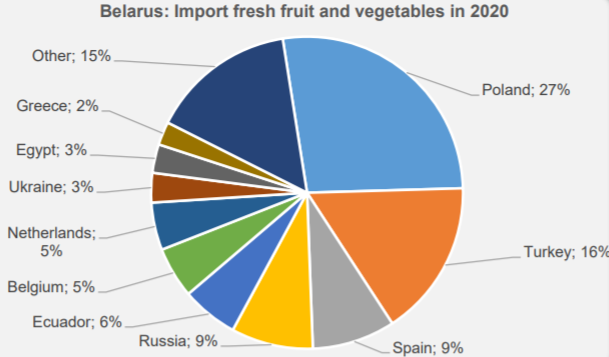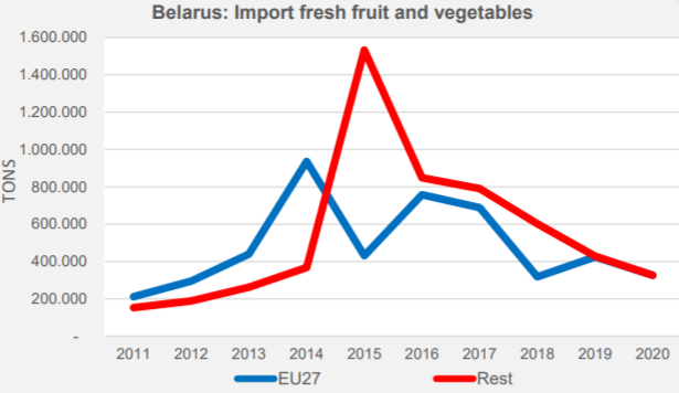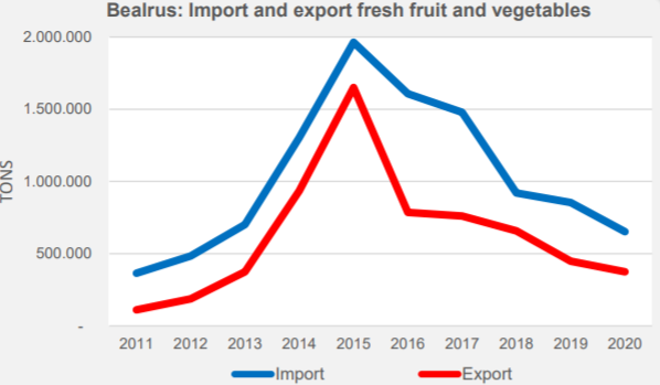 Les importations biélorusses de fruits et légumes frais ont atteint un pic de deux millions de tonnes en 2015. Après le boycott des importations imposé par la Russie à la mi-2014, les importations en Biélorussie ont bondi. Certaines années, selon les coutumes bélarussiennes, les fruits et légumes frais étaient importés de toutes sortes de pays souvent exotiques, y compris des poires du Yémen. Ce « commerce » a maintenant largement pris fin.