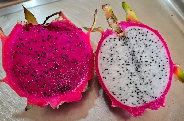 En Afrique du Sud, les plantations de fruits du dragon se répartissent à peu près également entre les fruits à chair blanche et les fruits à chair rose ; la plupart des nouvelles plantations concernent les fruits à chair rose et rouge, dont il existe davantage de variétés, explique Fred.