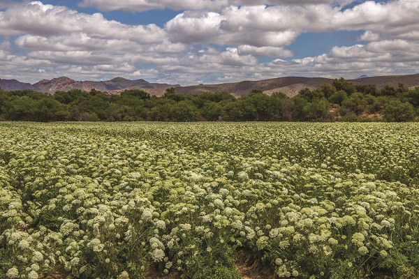 Un champ de carottes en fleurs cultivées pour les semences par Klein Karoo Seed Production