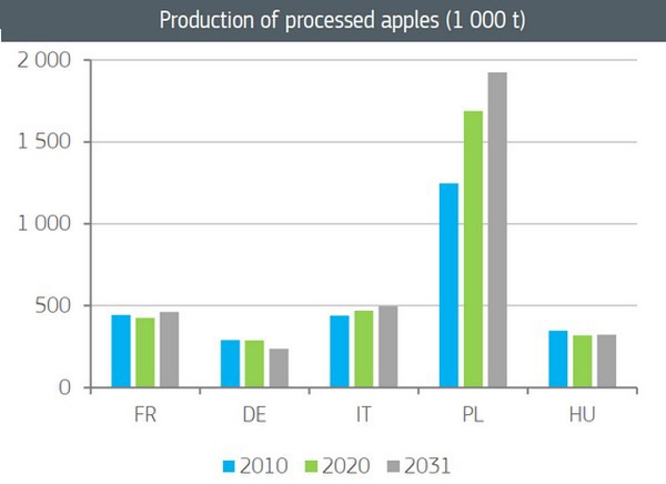 D'ici 2031, la production de pommes transformées devrait augmenter en France, en Italie et en Pologne, de 0,5 % à 1,2 % par an. En Hongrie, la production devrait légèrement augmenter (de 0,2 % par an).