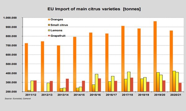 Pour la saison 2020/2021, les importations d'oranges dans l'UE ont légèrement diminué par rapport à la saison précédente, tout comme les importations de pomelos. Les chiffres des importations de petits agrumes et de citrons étaient légèrement plus élevés.