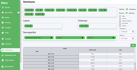 Pommaflow offre un service complet : tonnages/ha, passage de récolte, gestion du personnel avec rendements/ha, nombre de palox et même préparation des fiches de paie (rendement, horaires…) Un gain de temps précieux pour les professionnels.