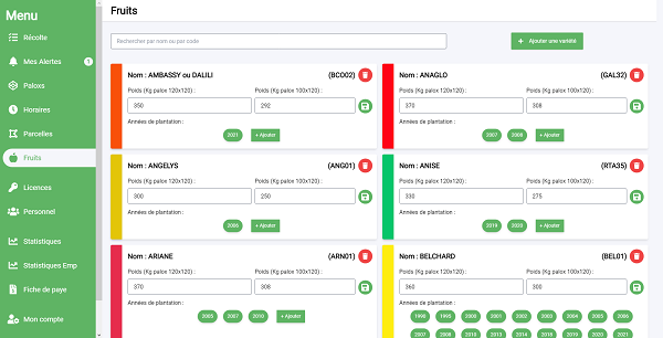 L’application fonctionne en deux temps. D’abord la partie paramétrage dans laquelle les producteurs vont entrer toutes les informations nécessaires : parcellaire, surface, variétés, personnel saisonnier, chef d’équipe. Une fois que tout est paramétré, la suite se déroule sur le terrain. « Chaque chef d’équipe dispose de son smartphone avec l’application où il va pouvoir rentrer les informations concernant les personnes qui travaillent, chantiers, type de cueille, rendement attendu, temps de travail. Quand un palox est plein le chef d’équipe va apposer une étiquette avec un code barre sur le palox et dire qui a cueilli. »