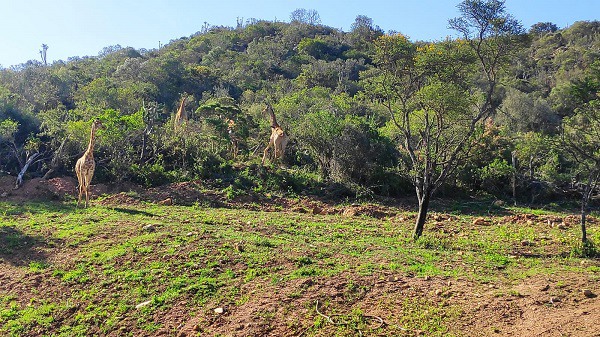 Des girafes dans la brousse revivifiée autour du barrage de Kouga après les récentes pluies qui ont suivi des années de sécheresse (photo de Frik du Preez)