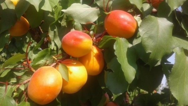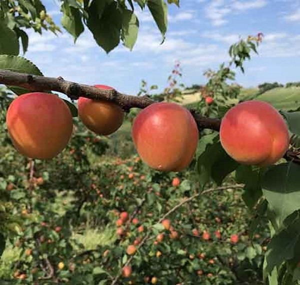 Fruit : taille élevée et forme oblongue, légèrement asymétrique, la peau est jaune-orange avec une surcoloration rouge sur 20-30 % de la surface. La pierre est proéminente.