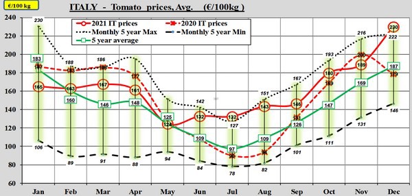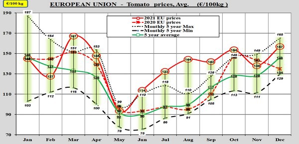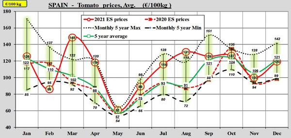 L'Espagne reste à la traîne dans l'escalade des prix des tomates. L'année s'est terminée avec un prix moyen en décembre juste en dessous de la moyenne quinquennale. Depuis septembre, le prix moyen de la tomate avait déjà suivi cette moyenne et le mois de décembre n'y a rien changé, malgré une évolution du marché apparemment favorable aux Espagnols avec la crise énergétique en Europe du Nord-Ouest.