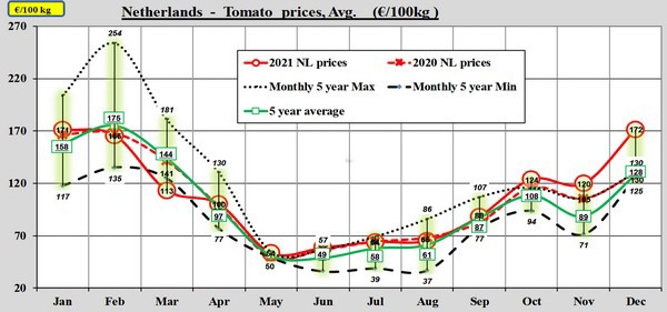 Aux Pays-Bas, l'augmentation des prix est plus extrême. Le graphique présente un pic en décembre, bien au-dessus de toutes les moyennes précédentes. Les augmentations de prix mentionnées précédemment pour les tomates cerises et les tomates en grappe par rapport à novembre y ont contribué.